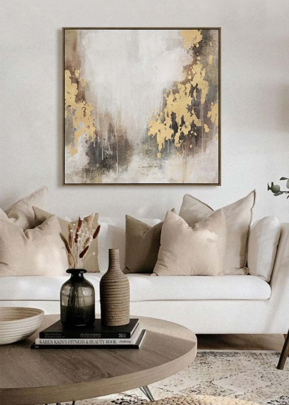 Large framed abstract print finished with oil on canvas. This modern abstract print is hand finished, with no two the same, and has beautiful paint strokes and gold leaf finish. Please note that the dimensions are for the oil on canvas only and exclude frames which typically add an extra 1-2 cm on top.