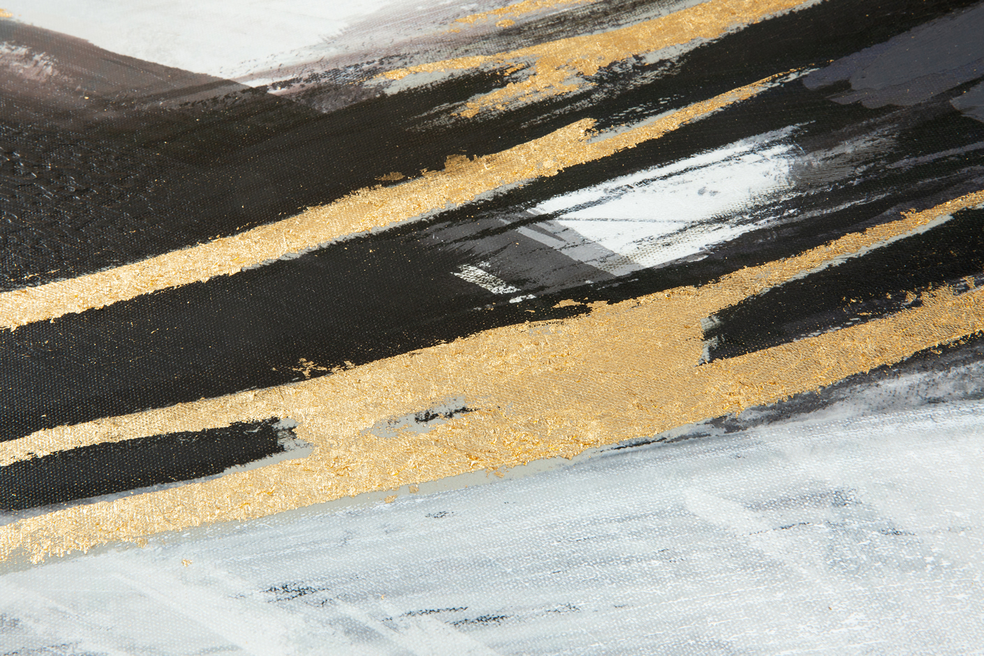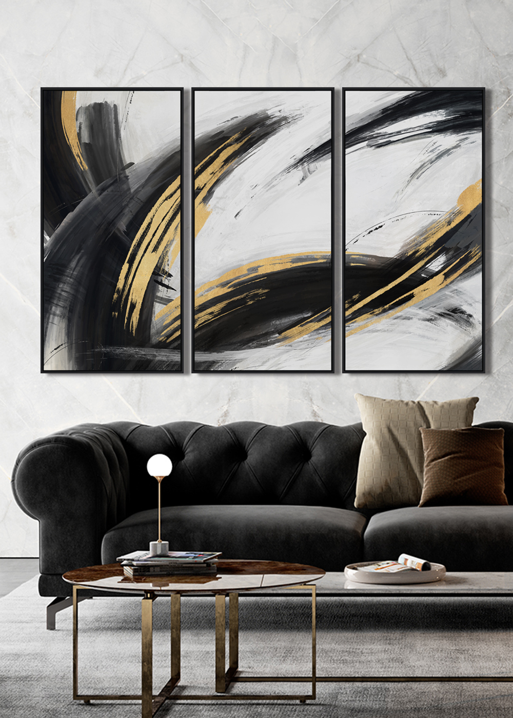 Set of 3 hand-finished prints. These modern abstract prints are hand finished, with no two the same and include beautiful pallette knife textures and finished in gold leaf. Please note that the dimensions are for the oil on canvas only and exclude frames which typically add an extra 1-2 cm on top.