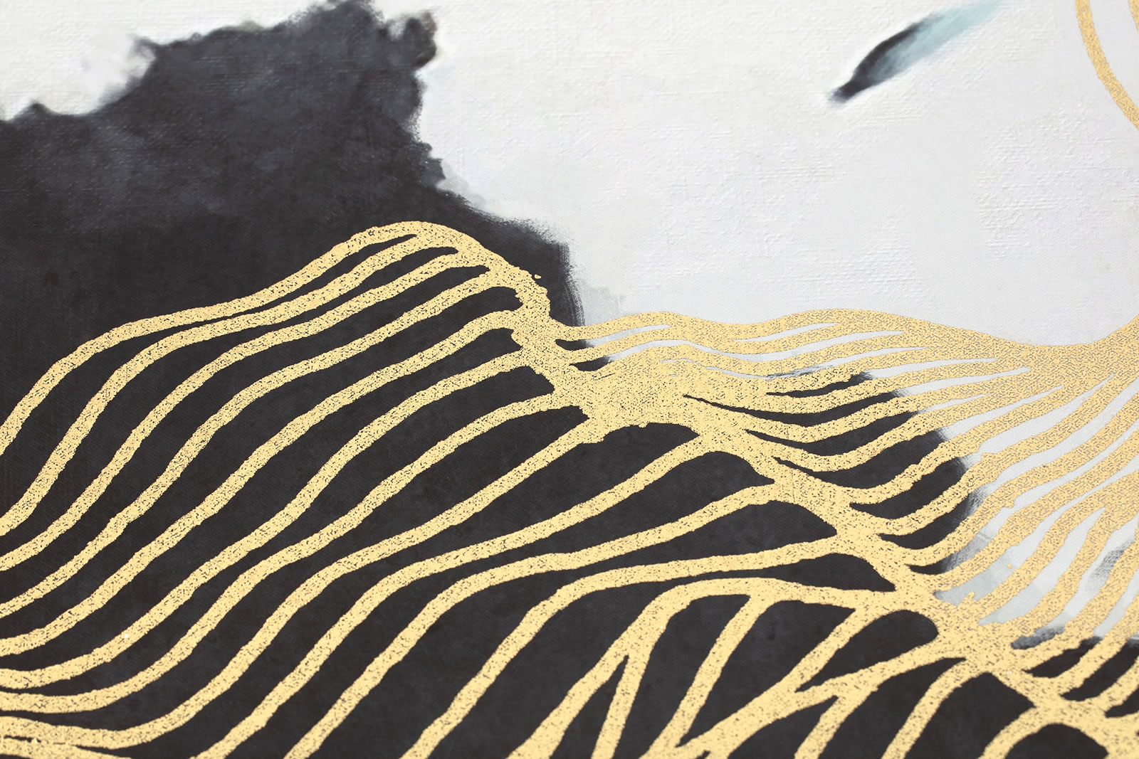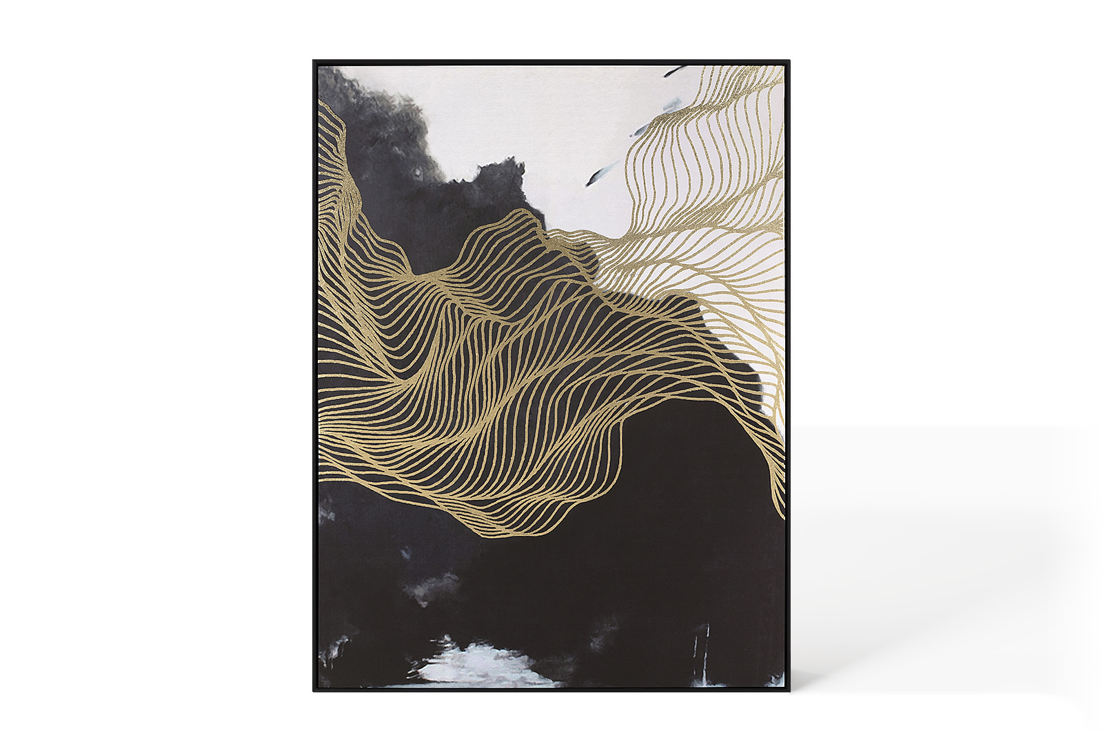 Large abstract artwork. Printed canvas with matt black frame and machined gold ofil print design. Please note that the dimensions are for the canvas only and exclude frames which typically add an extra 2-4 cm on top. Couples perfectly with