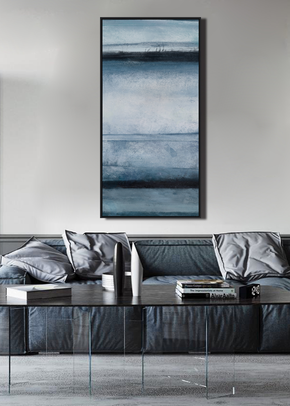 Large framed abstract print finished with with oil on canvas. This modern abstract print is hand finished, with no two the same, and has beautiful paint strokes and pallette knife textures. Please note that the dimensions are for the oil on canvas only and exclude frames which typically add an extra 1-2 cm on top.