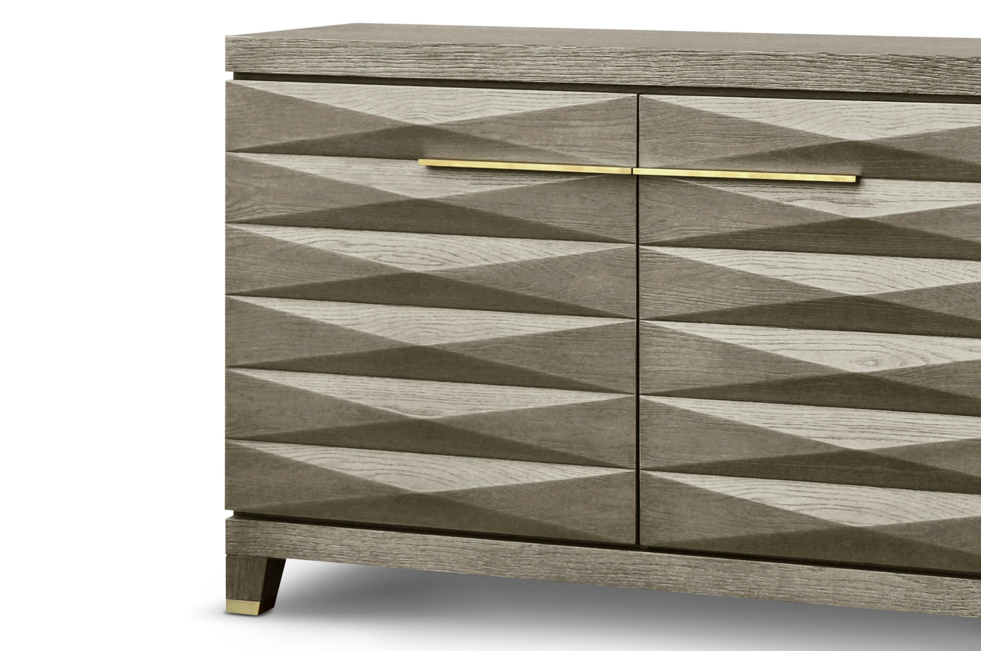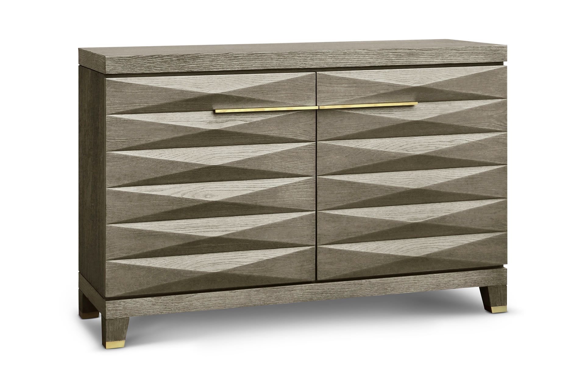 The Cassis 2-Door Console comes in a striking diamond shaped design, which is finished in textured grey/taupe coloured oak veneer, and is fitted with gold handles. Modern with an inspired design, the Cassis Console can help achieve the perfect finish in any home or interior design project.