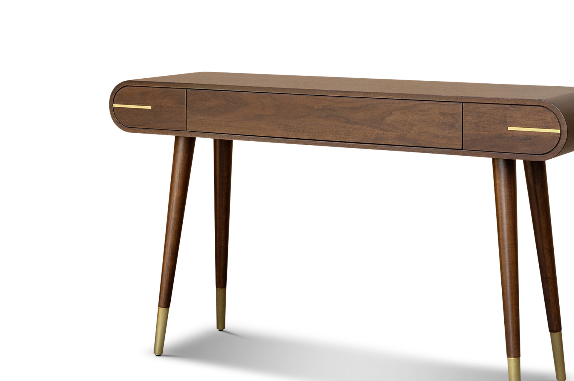 The Malibu Console Table comes in a natural walnut veneer with brass features. With its curved and uniqe design, the Malibu console can help achieve the perfect finish in a any home or interior design project.