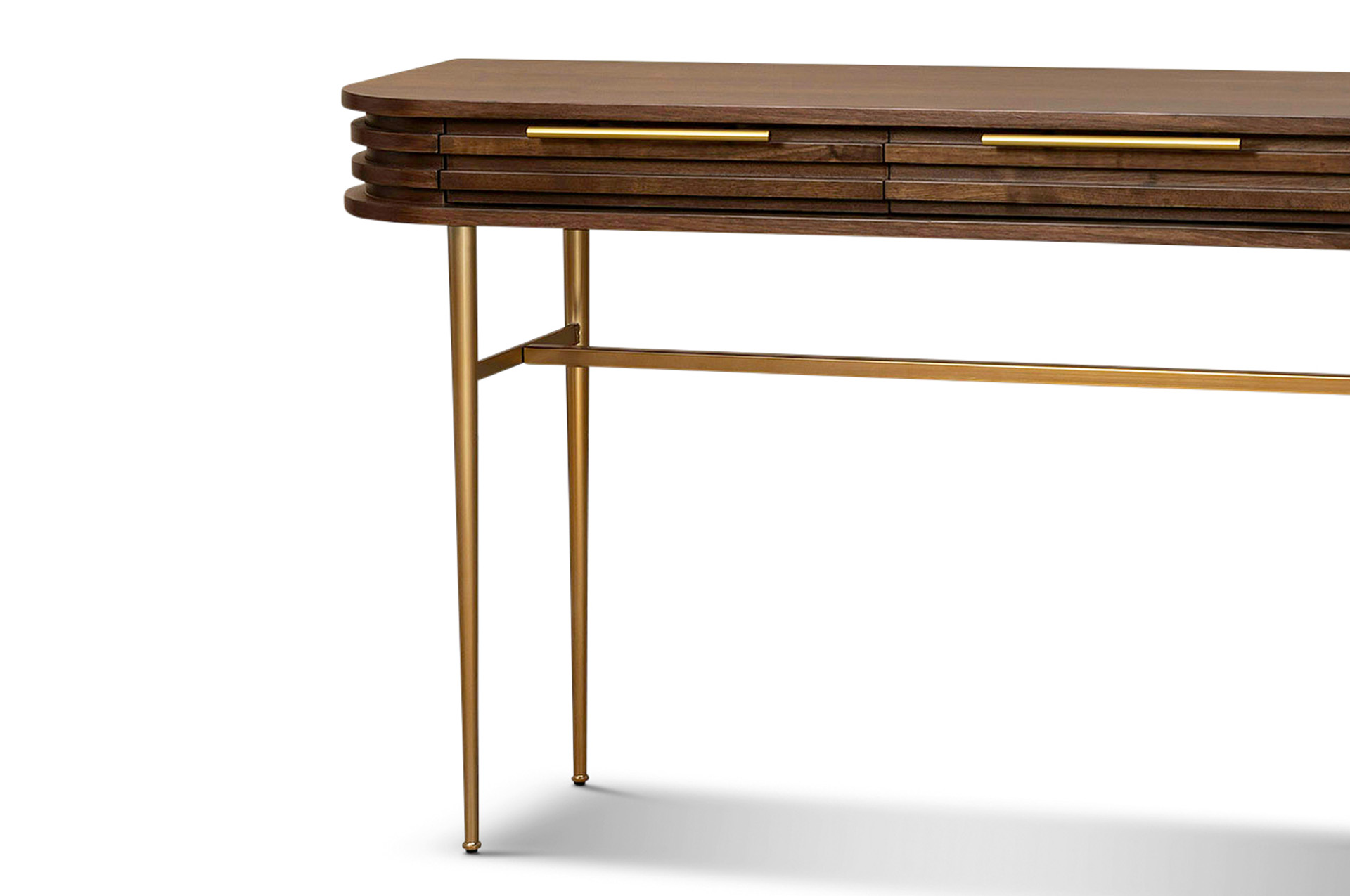 Inspired by the days of high glamour, the Paris console table with 2-Drawers is a modern twist on mid 19th century Art Deco. Beautifully finished in natural walnut veneer, the Paris console has 2-drawers with brass handles and legs. The Paris console can help achieve the perfect finish in a any home or interior design project.